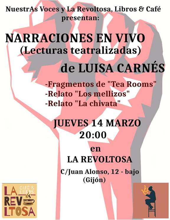 Se leerán fragmentos de "Tea Rooms", y los relatos "Los mellizos" y "La Chivata". ENTRADA LIBRE. Recogemos vuestra voluntad, ♥