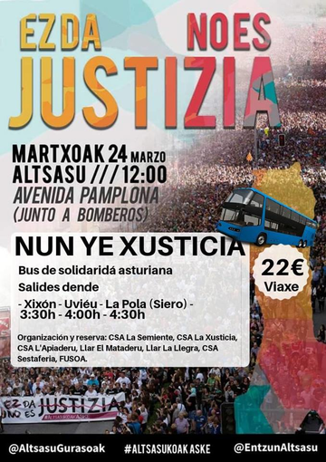 Dende los diferentes Centros Sociales Autoxestionaos d'Asturies: La Semiente, La Xusticia, Sestaferia, L'Apiaderu, Llar El Mataderu, Llar La Llegra y La Llume, facemos un llamamientu a participar nel bus solidariu pa tar presentes na movilización del Domingu 24 de Marzu en Altsasu a les 12:00 col llema EZ DA JUSTIZIA (NUN YE XUSTICIA).