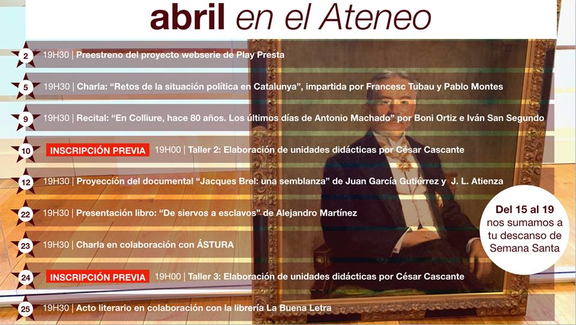 El próximo viernes, 5 de abril, a las 19H.30', en el local social del Ateneo Obrero de Gijón (Cl Francisco Tomás y Valiente, 1 - 2ª planta / Escuela de Comercio), tendrá lugar una mesa redonda bajo el título Retos de la situación política en Catalunya, con la intervención de Francesc Tubau y de Pablo Montes. El acto está organizado por IDEAS (Izquierda de Asturias) y el Ateneo Obrero de Gijón.