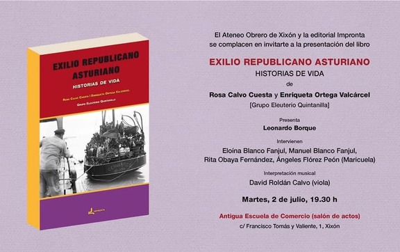 El próximo martes, 2 de julio, a las 19H.30', en el Salón de Actos de la Escuela de Comercio (Cl Francisco Tomás y Valiente, 1), tendrá lugar la presentación del libro Exilio republicano asturiano. Historias de vida, de Rosa Calvo Cuesta y Enriqueta Ortega Valcárcel integrantes del Grupo Eleuterio Quintanilla (Sección de Educación del Ateneo Obrero de Gijón). La edición corre a cargo de Impronta Editorial.