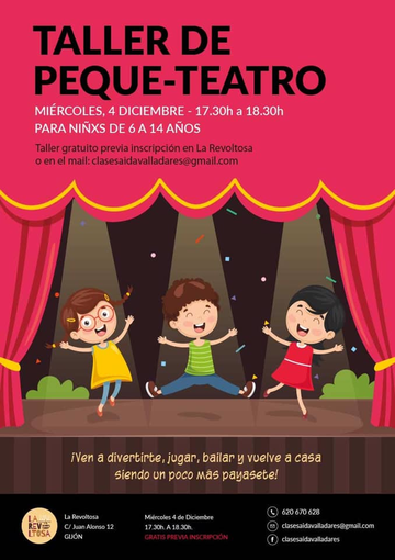 La actriz Aida Valladares, encargada de nuestro grupo para adultos, Teatro Revoltoso, imparte un taller de teatro para l@s más peques, el miércoles 3 de diciembre de 17.30h a 18.30h.