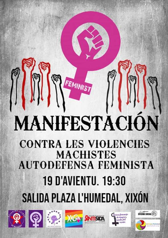 Un añu más facemos esta manifestación de diciembre escontra les Violencies Machistes, viendo como la cifra de muyeres asesinaes nun para de crecer. Pero los asesinatos son la punta del iceberg de toles violencies que sobre nosotres exercen solo por ser muyeres: violaciones, abusos, desigualdades...cualesquier discriminación incrementase al ser muyeres. Poro esti añu varios coleutivos feministes nos unimos pa debatir, compartir y sobre too caminar xuntes, pa siguir creando redes y apoyu mutuu, conscientes de que toles lluches son la mesma, y de que xuntes somos más fuertes.