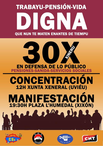 El xueves 30 de xineru tenemos una xornada de MOVILIZACIÓN, pela mañana CONCENTRACIÓN n'Uviéu delantre la Xunta Xeneral a les 12 hores y pela tarde MANIFESTACIÓN en Xixón a les 19:30 hores con salida dende la Plaza l'Humedal y finalización delantre la Seguridá Social na Plaza'l Carmen.