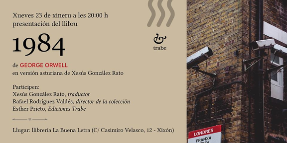 Xueves 23 de xineru a les 20:00 h presentación del llibru «1984» de GEORGE ORWELL, en versión asturiana de Xesús González Rato.