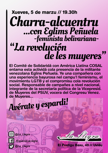 A la fin, una bona oportunidá pa sentir a una militante venezolana que nos va falar de "la revolución de les muyeres" nesta selmana que fina'l domingu col 8 de marzu y tola riestra de movilizaciones feministes n'Asturies y en tol planeta.