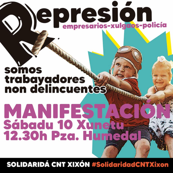 Ante les desproporcionaes condenes a ocho compañeres pol conflictu sindical ente la CNT y La Suiza, les organizaciones firmantes llamamos al pueblu d'Asturies a responder arropando a les compañeres na manifestación que va partir de la Plz. L'Humedal el 10 de Xunetu a les 12:30 ![]()