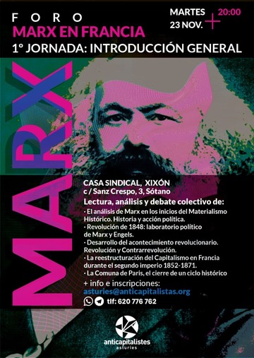 El martes 23 a las 20:00 en la Casa Sindical de Xixón empezamos el Foro de Marx con la primera Jornada que abarcará los siguientes bloques: