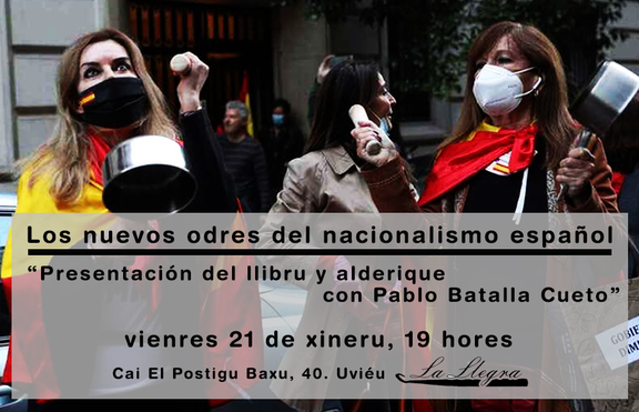 El viniente vienres 21 de xineru, a les 19h nel Llar La Llegra (El Postigu Baxu, 40, Uviéu), vamos cuntar col autor del llibru y abrir l'alderique sobre les fontes de les que bebe'l nuevu resurdir del nacionalismu español y la ultraderecha: faciendo un repasu sobre les nueves referencies que remanen les dereches na so batalla cultural a la d'esparder el nacionalismu, les polítiques económiques antisociales y, con ello, l'odiu a la diversidá social, cultural y a la tolerancia.