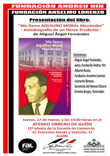 El próximo jueves, 17 de marzo, a las 19H.00', en el local social del Ateneo Obrero de Gijón (2ª Planta de la Escuela de Comercio, Cl Francisco Tomás y Valiente, 1), tendrá lugar la presentación del libro Me llamo Aquilino Moral Menéndez. Autobriografía de un héroe prudente, de Miguel Ángel Fernández. El acto está promovido por la Fundación Andreu Nin y la Fundación Anselmo Lorenzo