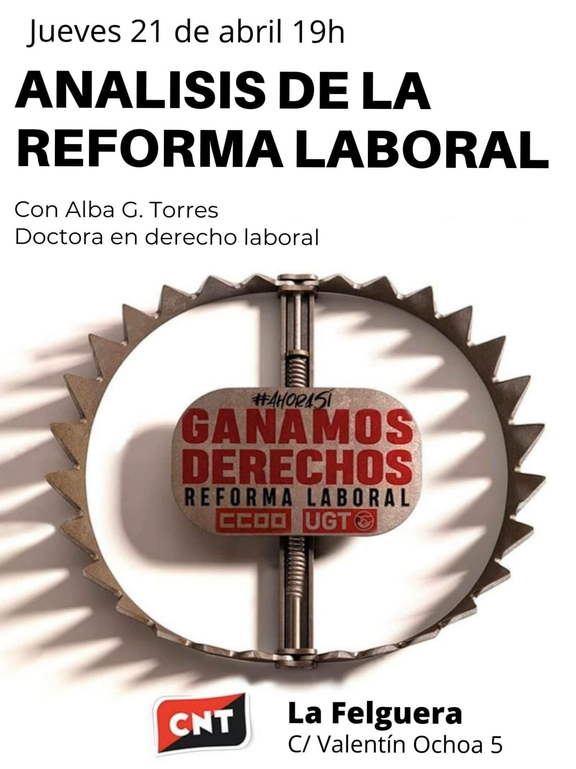 Estas y otras cuestiones que puedan surgir serán respondidas este jueves en el CSA La Xusticia por Alba profesora de derecho del trabajo en la Universidad de Oviedo y compañera de la CNT de La Felguera.