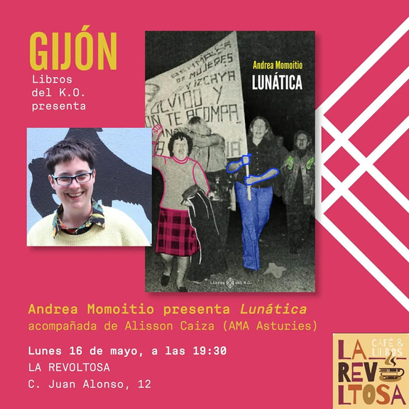 El lunes a las 19:30 tendremos Andre Momoitio en la Revol presentando su libro Lunática Libros del K.O.). Andrea es periodista y es una de las coordinadoras de la revista feminista Pikara Magazine. Le acompañará en la presentación Alisson Caiza, de AMA Asturies
