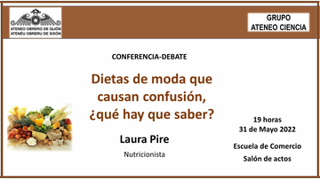 El próximo martes, 31 de mayo, a las 19H.00', en el Salón de Actos de la Escuela de Comercio (Cl Francisco Tomás y Valiente, 1), organizado por el Ateneo Obrero de Gijón, tendrá lugar una conferencia titulada Dietas de moda que causan confusión ¿Qué hay que saber?, a cargo de la nutricionista Laura Pire.