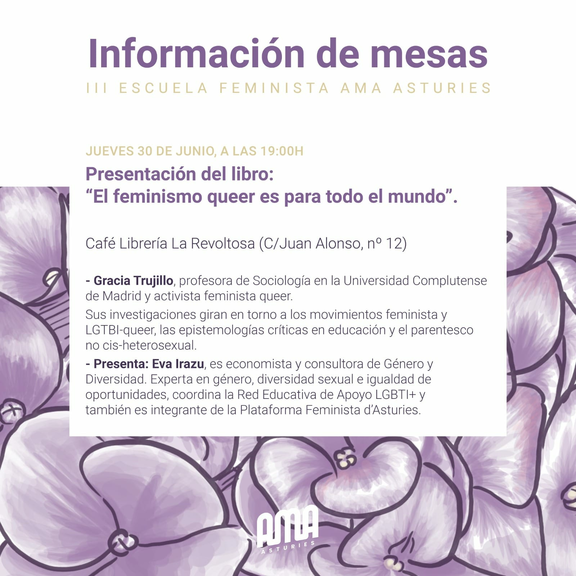 El jueves, en el marco de la Escuela de Pensamiento Feminista de @ama_asturies, presentaremos en La Revol el libro "El feminismo queer es para todo el mundo", contaremos con la presencia de su autora @gracetruj .