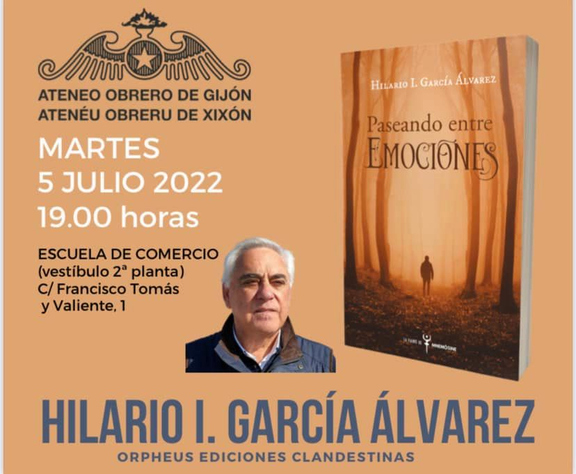 El próximo martes, 5 de julio, a las 19H.00', en el Vestíbulo de la 2ª Planta de la Escuela de Comercio (Cl Francisco Tomás y Valiente, 1), el Ateneo Obrero de Gijón organiza la presentación del libro Paseando entre emociones, de Hilario I. García Álvarez, editado por ORPHEUS Ediciones Clandestinas.
